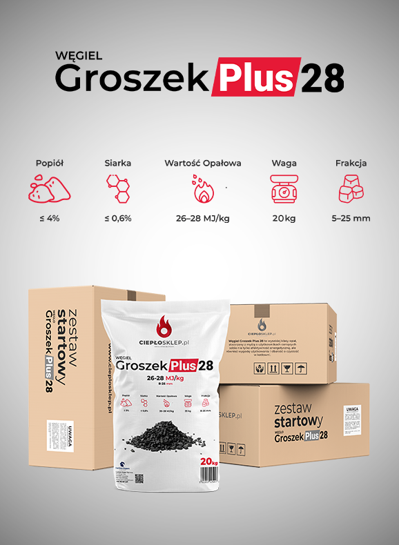 Flagowym produktem jest Węgiel Groszek Plus 28 (frakcja 8–25 mm, 26–28 MJ/kg) dostępny w workach 20 kg i 25 kg oraz na paletach 1 t. Ten standard jakości i opakowania możemy odtworzyć lub dostosować w wersji private label dla Twojej sieci.
